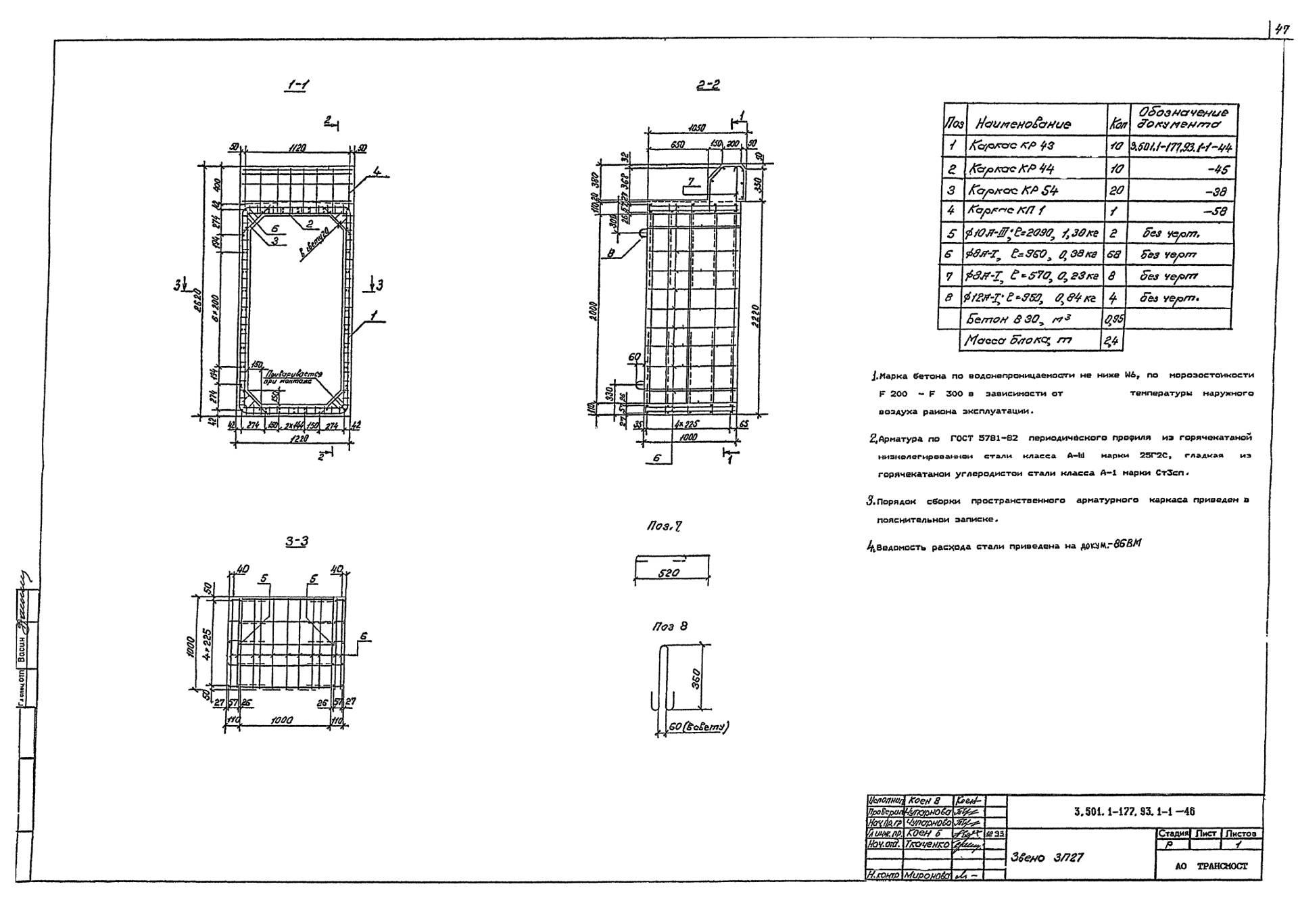 Трубы водопропускные и оголовка ЗП 27 для прямоугольных водопропускных труб изготавливаются в соответствии с ГОСТ 24547-81 «Звенья железобетонные водопропускных труб под насыпи автомобильных и железных дорог», ОСТ 35-27.0-85 «Звенья железобетонные круглых и прямоугольных водопропускных труб под железные и автомобильные дороги» из тяжелого конструкционного бетона. Класс бетона по прочности на сжатие принимается не ниже В15. Класс бетона по морозостойкости назначается в зависимости от климатического района строительства не ниже: F200 – при средней месячной температуре воздуха наиболее холодного месяца в районе строительства выше -15˚С; F300 – при средней месячной температуре воздуха наиболее холодного месяца в районе строительства ниже -15˚С. Класс бетона по водонепроницаемости принимается не менее W6. Дополнительно в бетонную смесь изделий вводятся вохдухововлекающие, газообразующие и пластифицирующие добавки для сопротивления воздействию агрессивных химических веществ, содержащихся в воде и грунте.